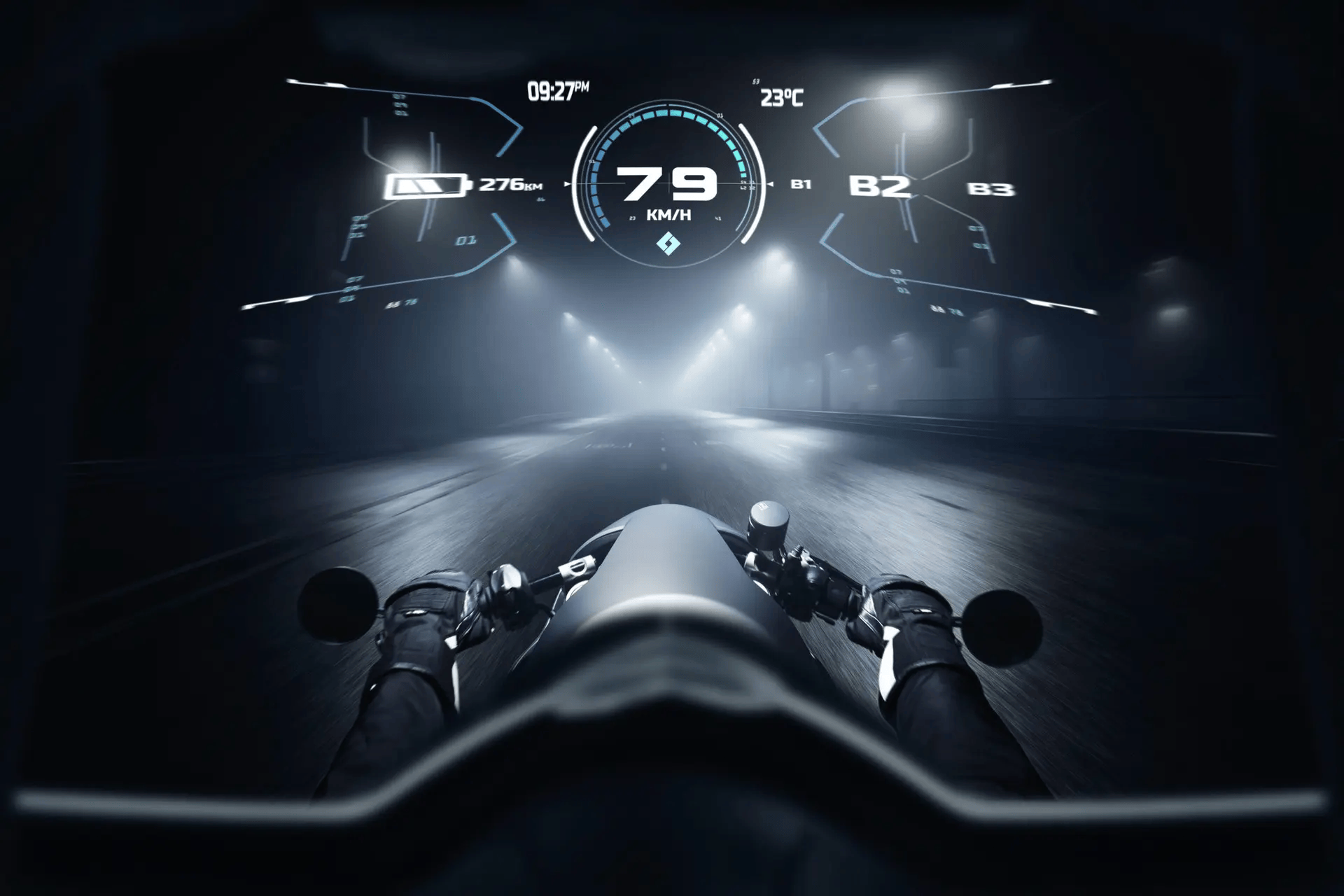 Rocket One 除了性能强悍,还搭载了 EyeLights 自家研发的 EyeRide 头盔抬头显示器(HUD) 系统。 通过内建的OLED屏幕,车手可以在安全帽内看到速度、电量、驾驶模式等信息,科技感满点!