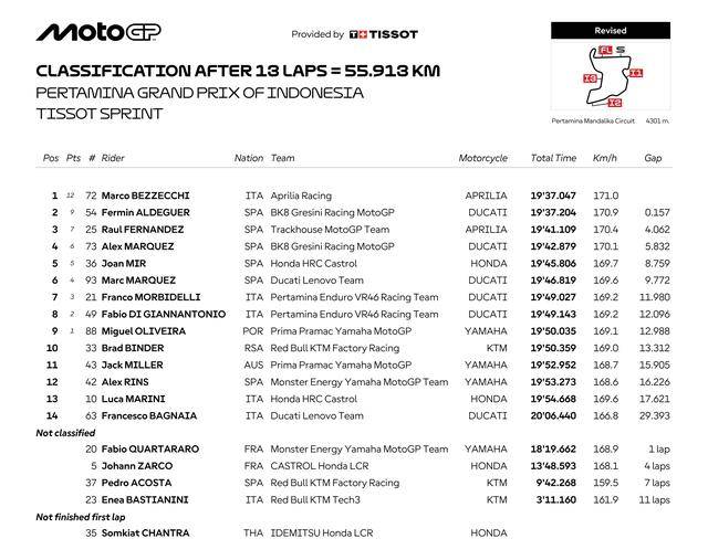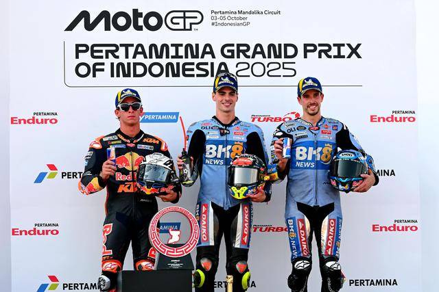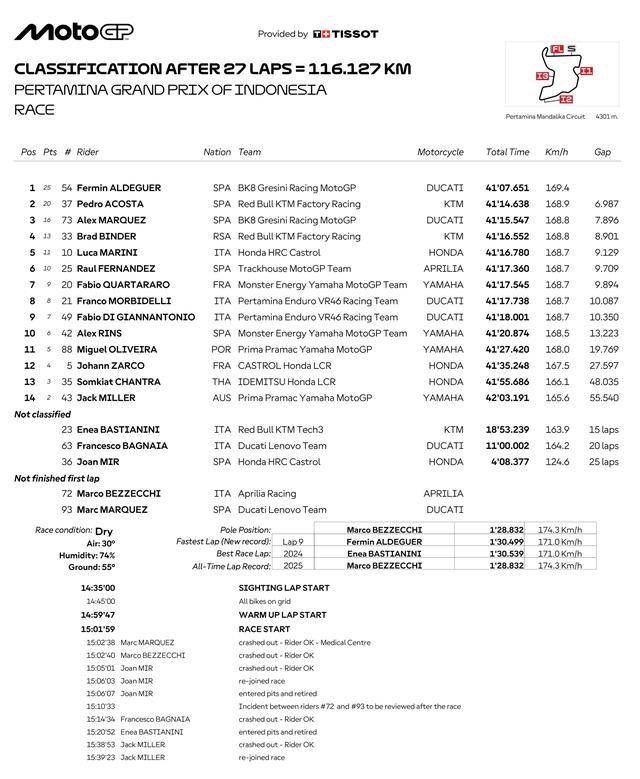 最终,阿尔德格以接近 7 秒的优势夺得了印尼站正赛的冠军,这是他今年升上最高级别以来的首个分站冠军。另一位西班牙车手、驾驶 37 号车的阿科斯塔(Pedro Acosta)获得了亚军;阿尔德格的队友、同样来自吉斯尼 MotoGP(Gresini MotoGP)车队的西班牙车手小马昆斯(Alex Marquez)拿到了季军,这个季军巩固了他在积分榜第二的位置,同时也助力他提前四站、夺得了 2025 赛季独立车队/卫星车队的最佳车手。