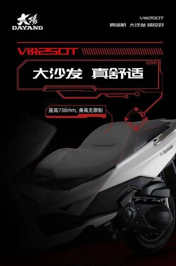 738mm低座高与加长踏板空间,配合人体工学座垫,实现“大沙发”级骑行姿态。车身采用高刚性车架与长轴距设计,增强直线稳定性。储物方面,座桶可容纳一顶3/4盔,前置物盒配备防滑内衬,方便存放随身物品。
