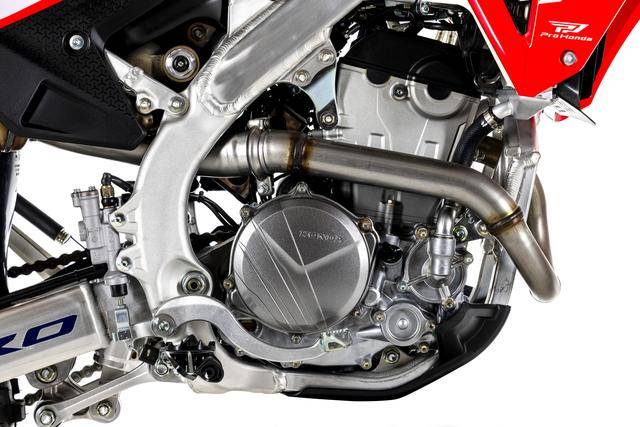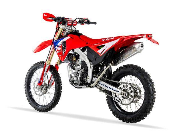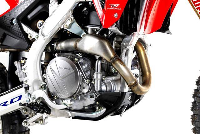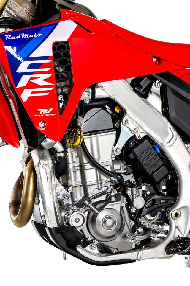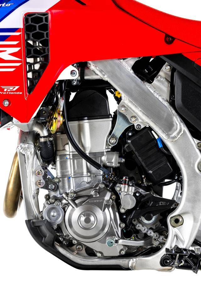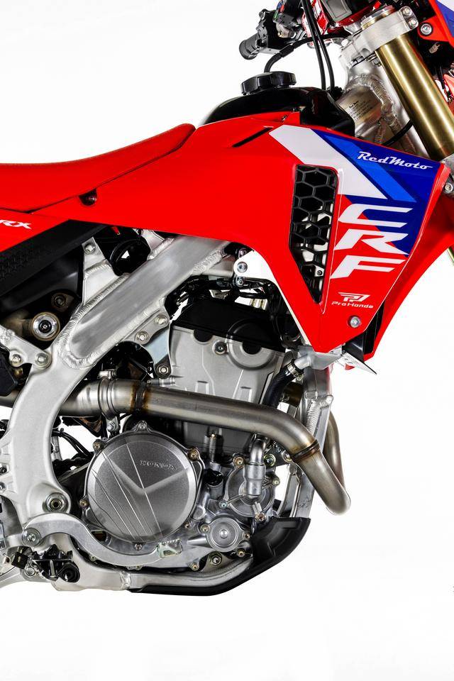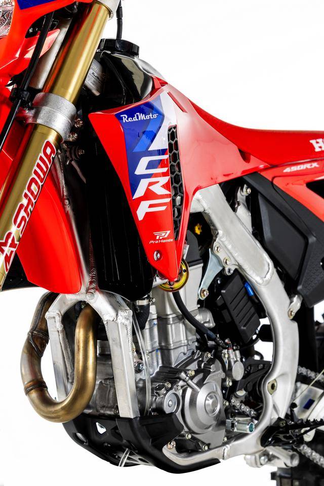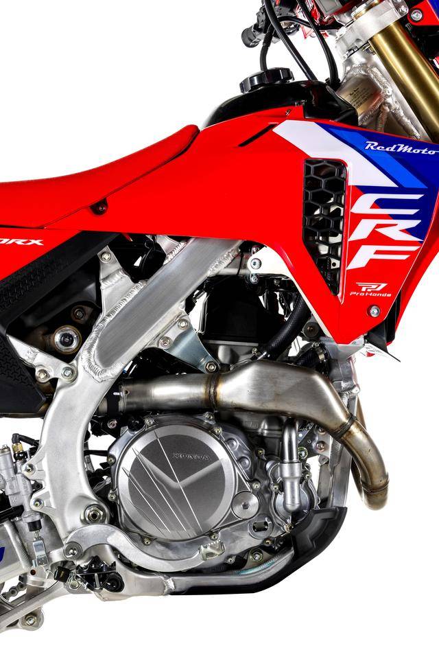CRF450RX 搭载一副来自 MX 场地越野赛车 CRF450R 的水冷四冲程单气缸、SOHC (Unicam)四气阀发动机,缸径、行程为 96 mm x 62.1 mm,排气量 449.7 cc,同样采用了电启动和五档的变速齿轮箱。