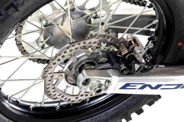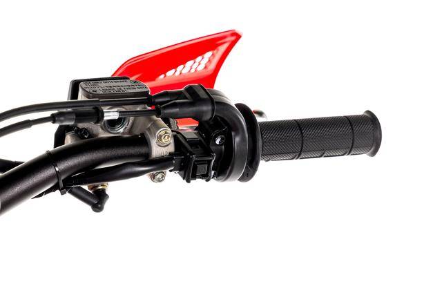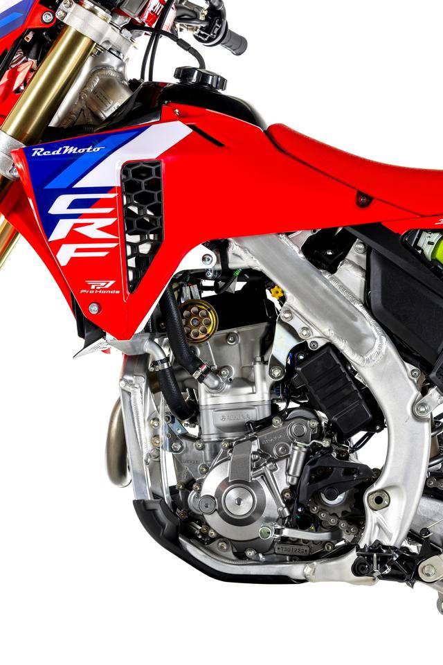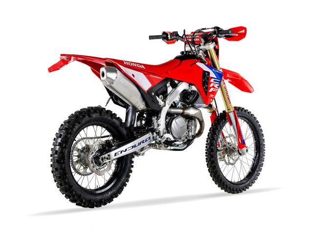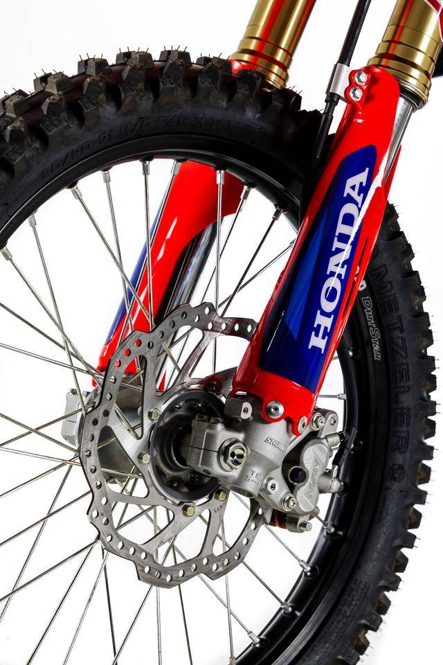 车体采用一副与现行 2025 CRF450RX 相同的铝合金制双翼樑车架,专为 Enduro 环境而设置前后悬挂系统,容量为 7.7 公升的油箱、LED 的灯光系统、侧脚架,前 21、后 18 英寸直径的车轮。电子辅助控制系统方面,标配了三个可以根据赛道当前条件而作出选择的 HSTC 牵引力控制系统(也可以选择关闭该系统),HRC 起步弹射控制,三个油图模式可选的 EMSB(Engine Mode Select Button,发动机模式选择按钮)系统。