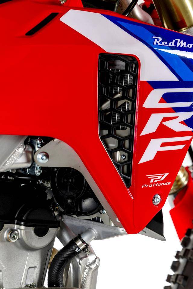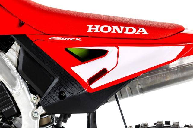 与 2025 款相比,2026 CRF250RX 的变化是换上了重新设计的鞍座下的左侧盖,新设计实现了无需借助工具、即可直接对空气滤清器进行维护。此外,还有灵感来自 Honda - RedMoto Enduro 工厂车队的新车身图案/贴花。
