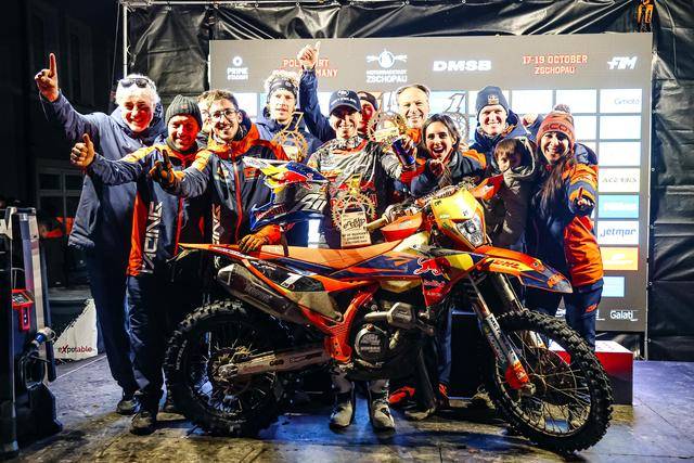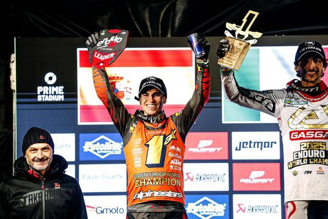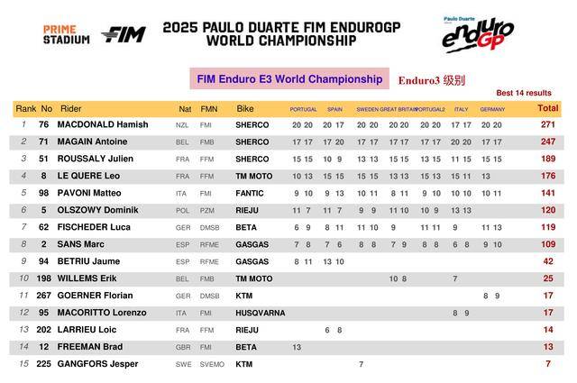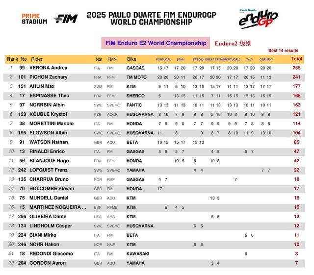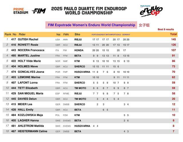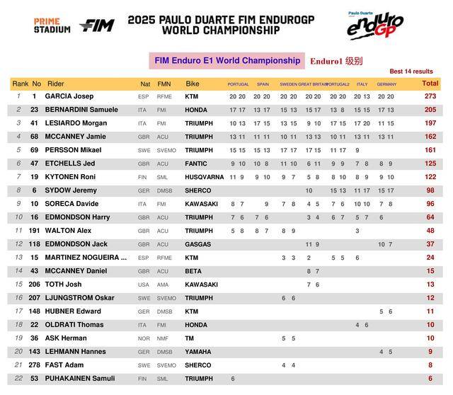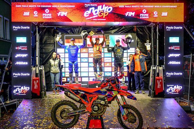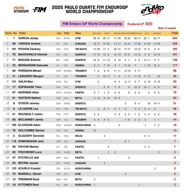 赛前,加西亚在 EnduroGP 级别的积分榜上有着 15 分的优势。德国站的比赛,加西亚夺得了第一节赛段(Stage 1)的冠军,维罗纳则获得了第二,加西亚的领先差距、扩大至 18 分;第二节比赛,维罗纳夺得了第一,加西亚获得了第二。最终,加西亚成功卫冕、夺得了 2025 赛季 Enduro 级别的世界冠军。