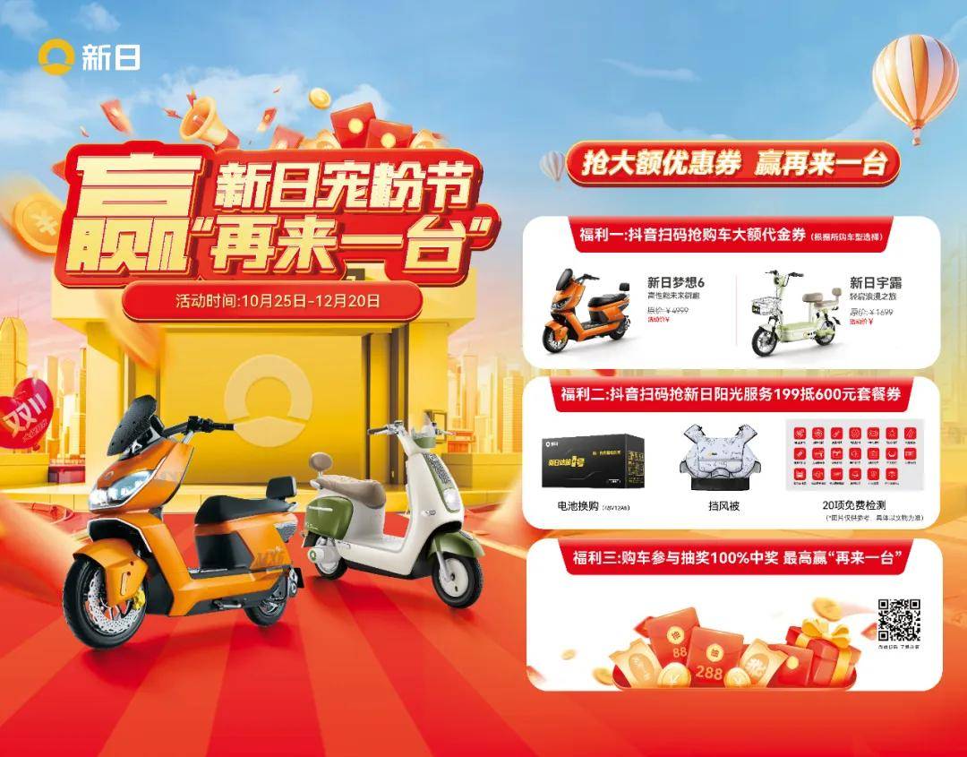 10月25日-12月20日的“宠粉节”期间,只要购买新日电动车就能参与火爆活动,享受超值优惠: