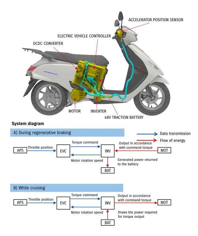 规格和配置上,e-Address 搭载一个中置式布局、峰值输出功率为 4.1 kw、最大扭矩15 N. m 的电机,容量为 60 Ah/3.07 kWh 的磷酸铁锂电池组、输出电压为 51.2 V;特定测试条件之下(WMTC Class 1)的续航距离为 87.1 公里。标配的 SDMS-e 可选骑行模式选择系统、提供三个不同的骑行模式(ECO 节能模式,Ride Mode A 标准模式,Rideo Mode B 最大输出模式)可选,另有一个倒车模式;此外,e-Address 还配备了一个具有能量回收功能的制动系统,可在车辆减速的过程中实现动能的回收。