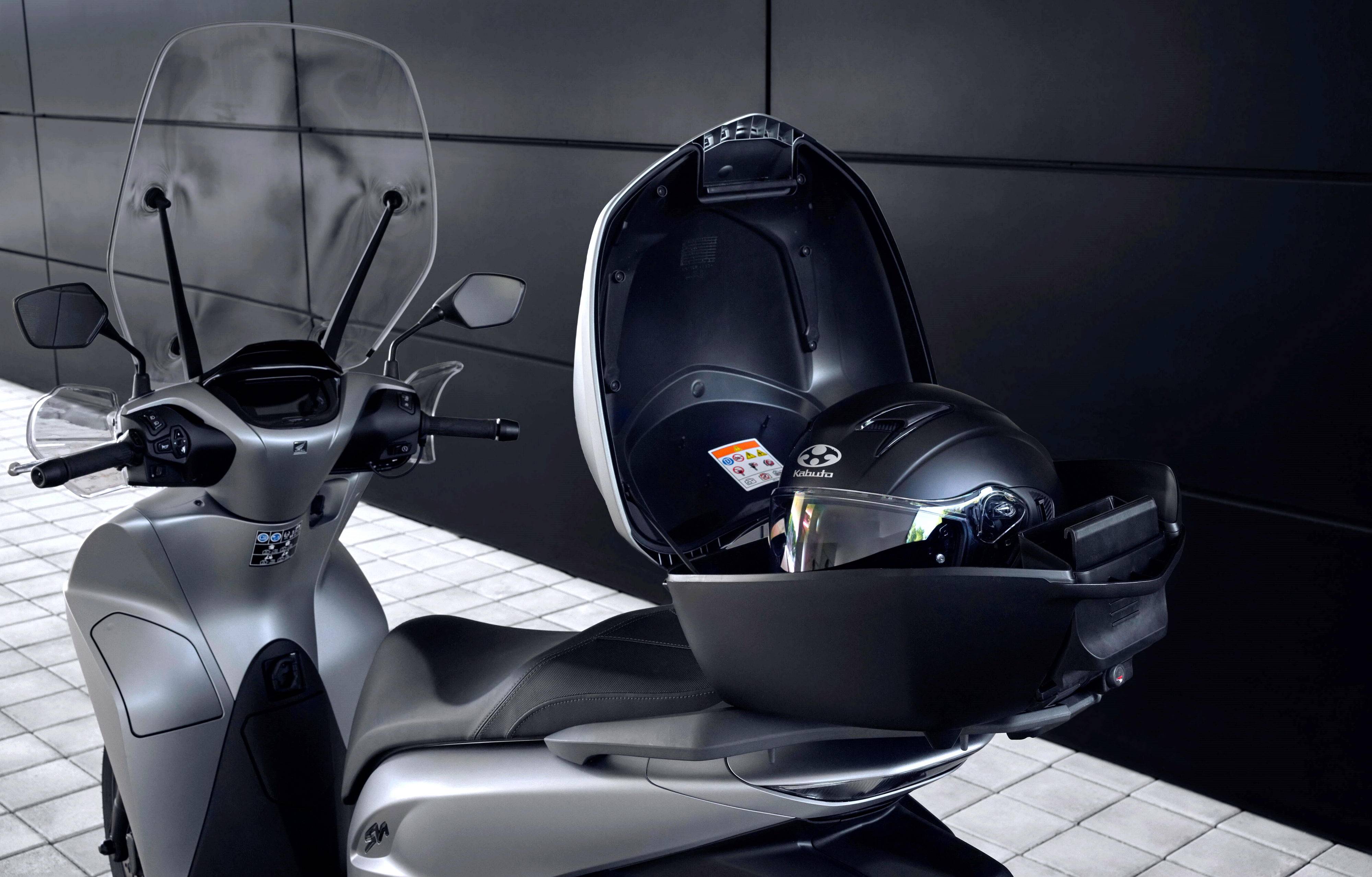 2、车体采用一副钢管式的车架,平的脚踏板、采用了直径为 16 英寸的前后车轮,是 Sh125i 和 Sh150i 的标志性设计;