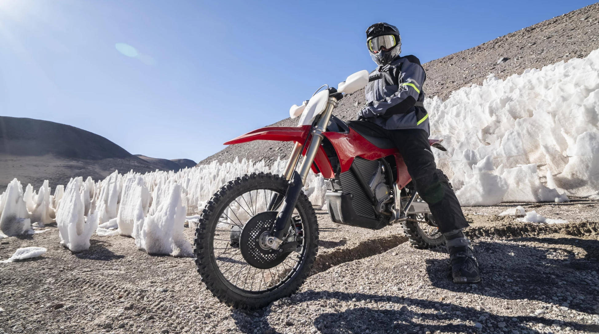 此次壮举的诞生地,是奥霍斯 - 德尔萨拉多火山。这座火山海拔 6893 米,是全球海拔最高的活火山,同时也是地球上环境最恶劣的区域之一。瑞士登山兼摩托车手伊日・扎克驾驶着这辆纯电动斯塔克 Varg EX,一路攀登至海拔 6721 米的高度。