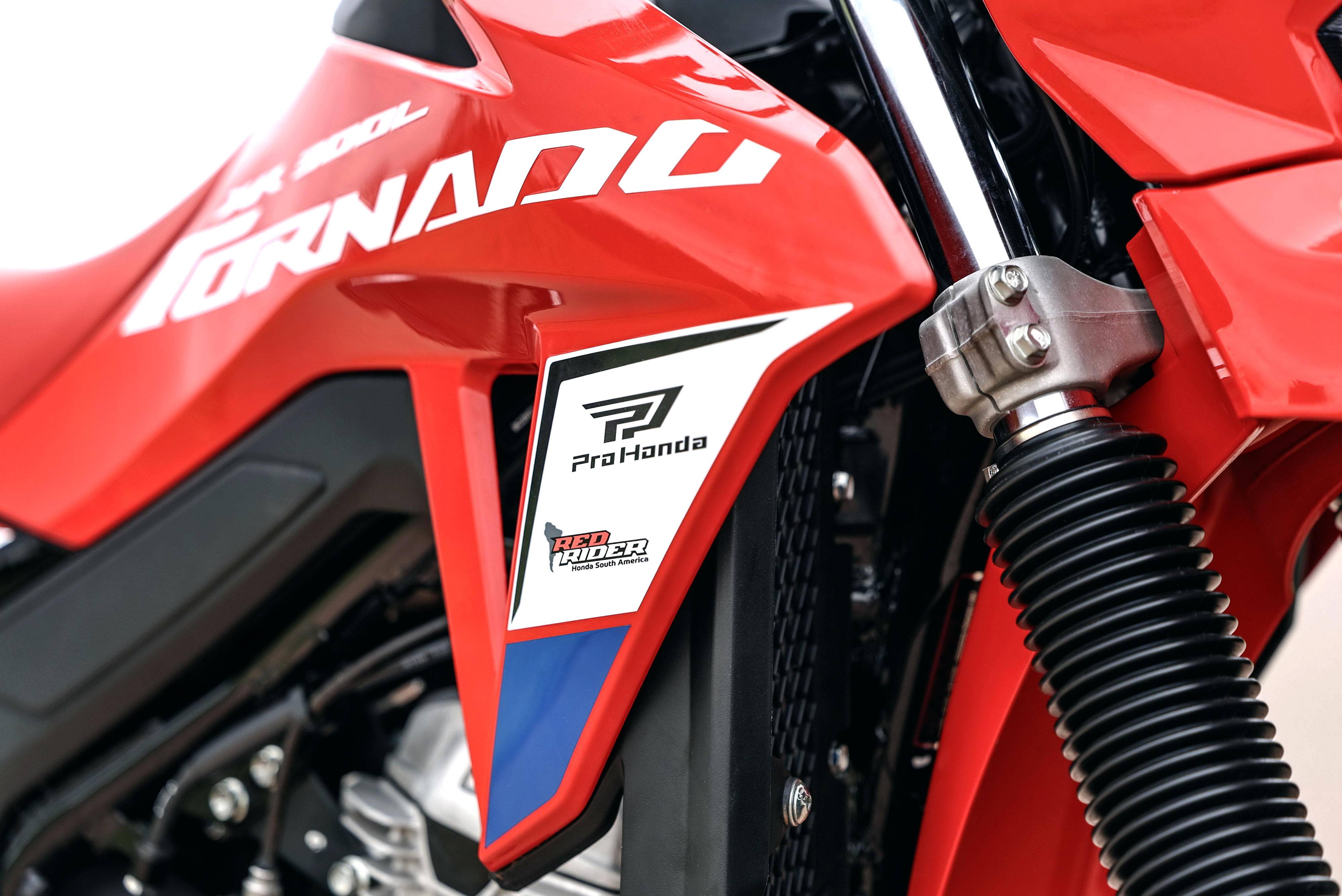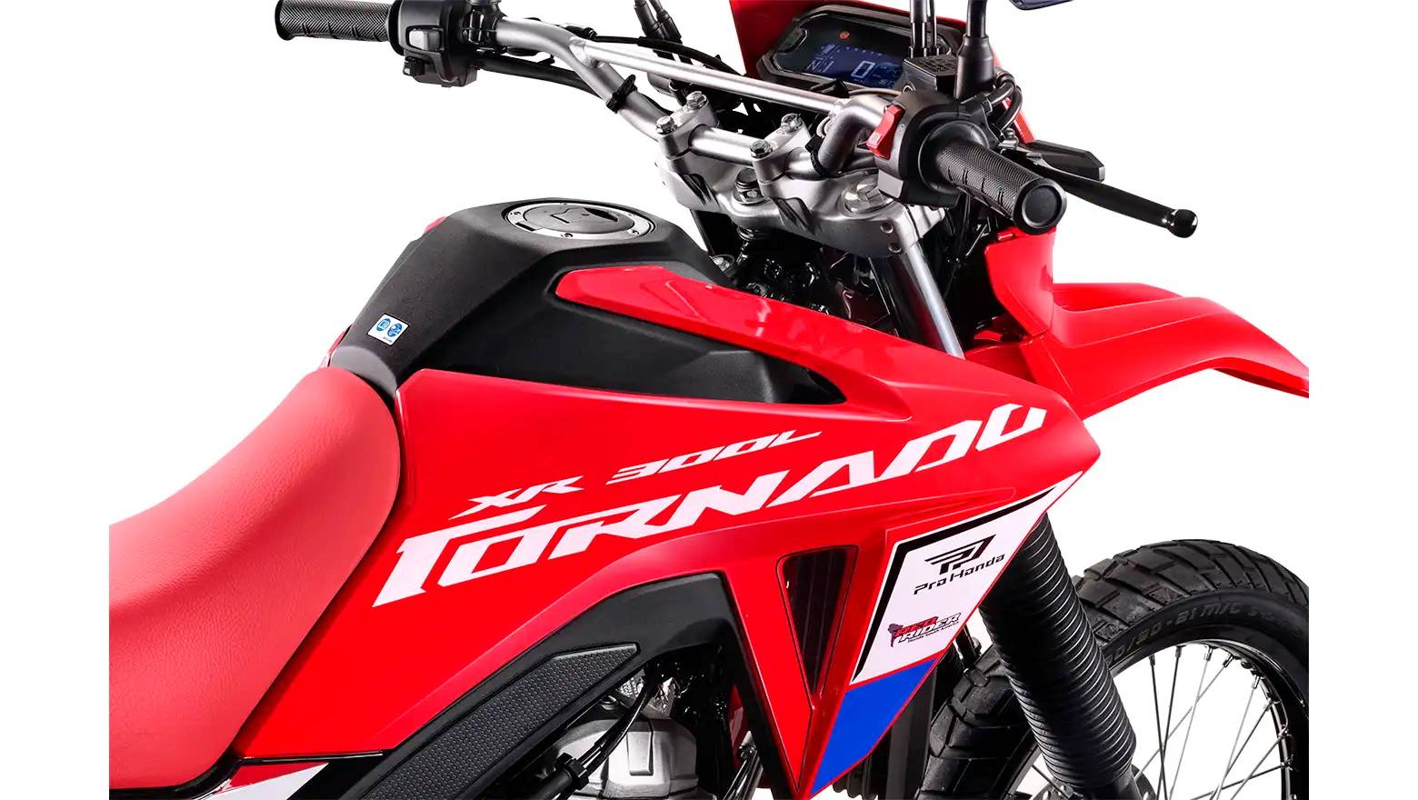 与标准款相比,2026 XR300L Tornado “ 龙卷风 ” 特别版主要的变化是车身图案/贴花:采用了一个名为 Fighting Red “ 战斗红 ” 的车身贴花,这是充满 Honda 传统风格的三色调;油箱的两侧,贴有 Pro Honda(Honda 在当地的润滑油品牌)和 Red Rider(Honda 在美洲多地举办的赛道体验活动名称)的标志。