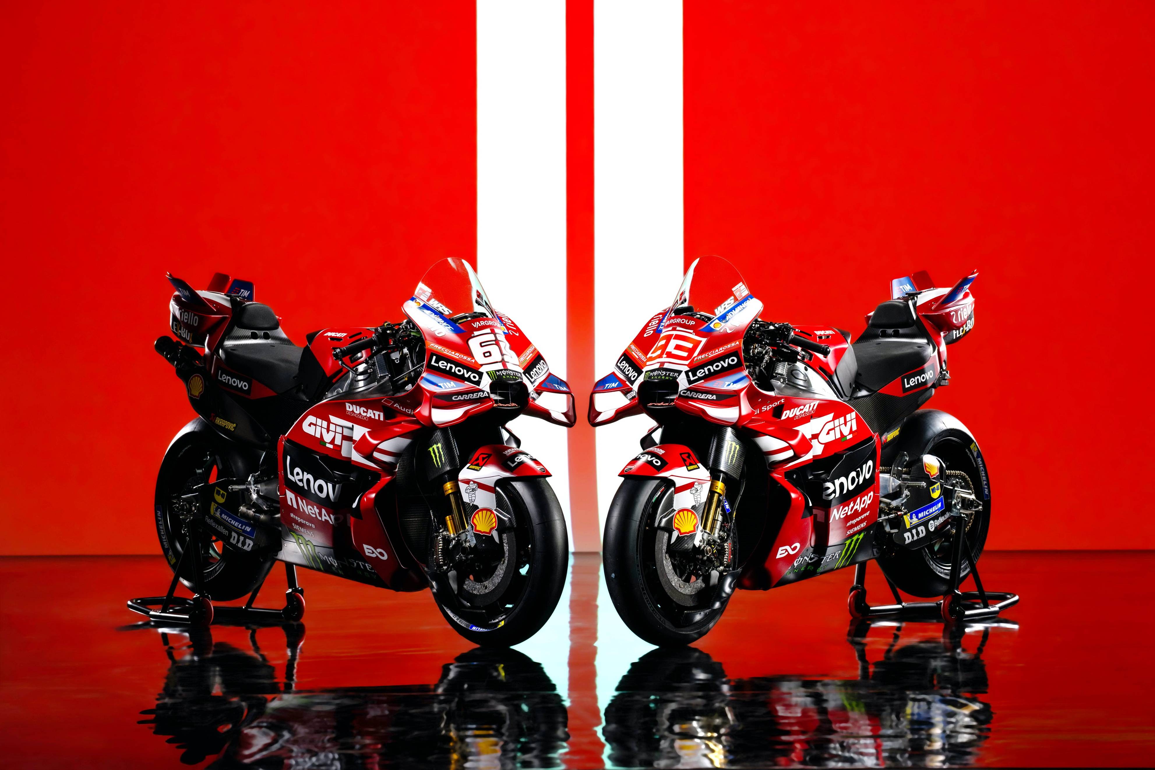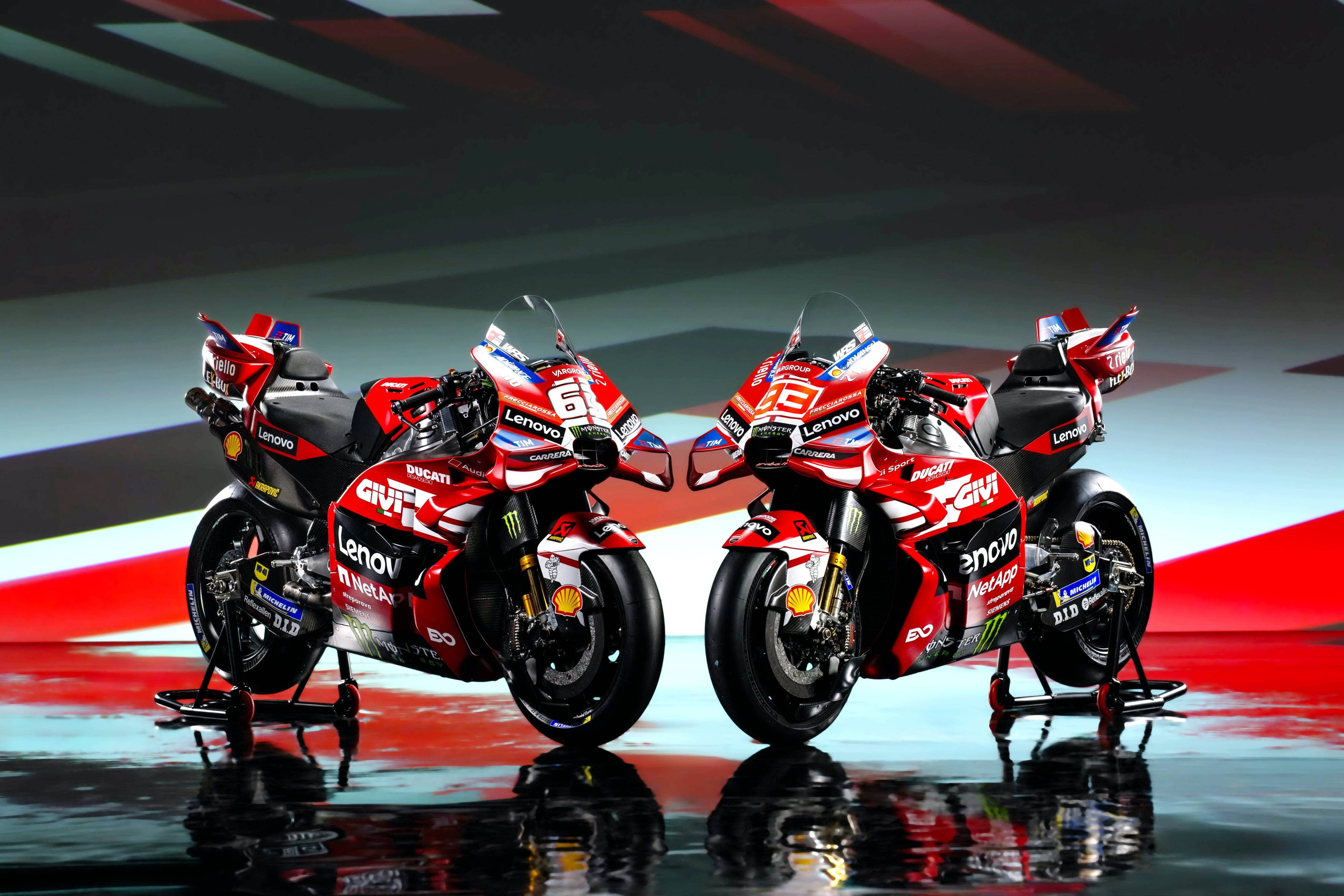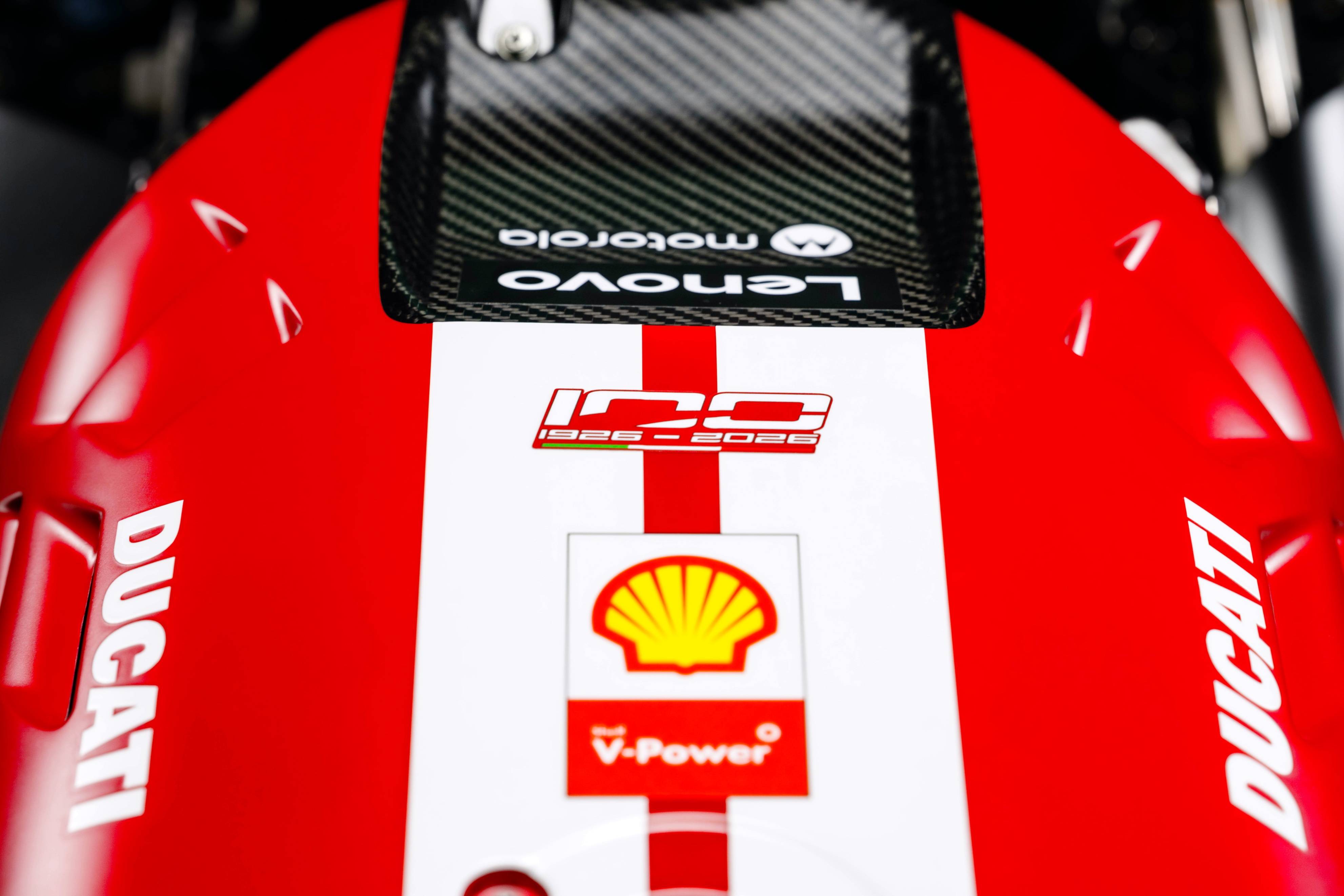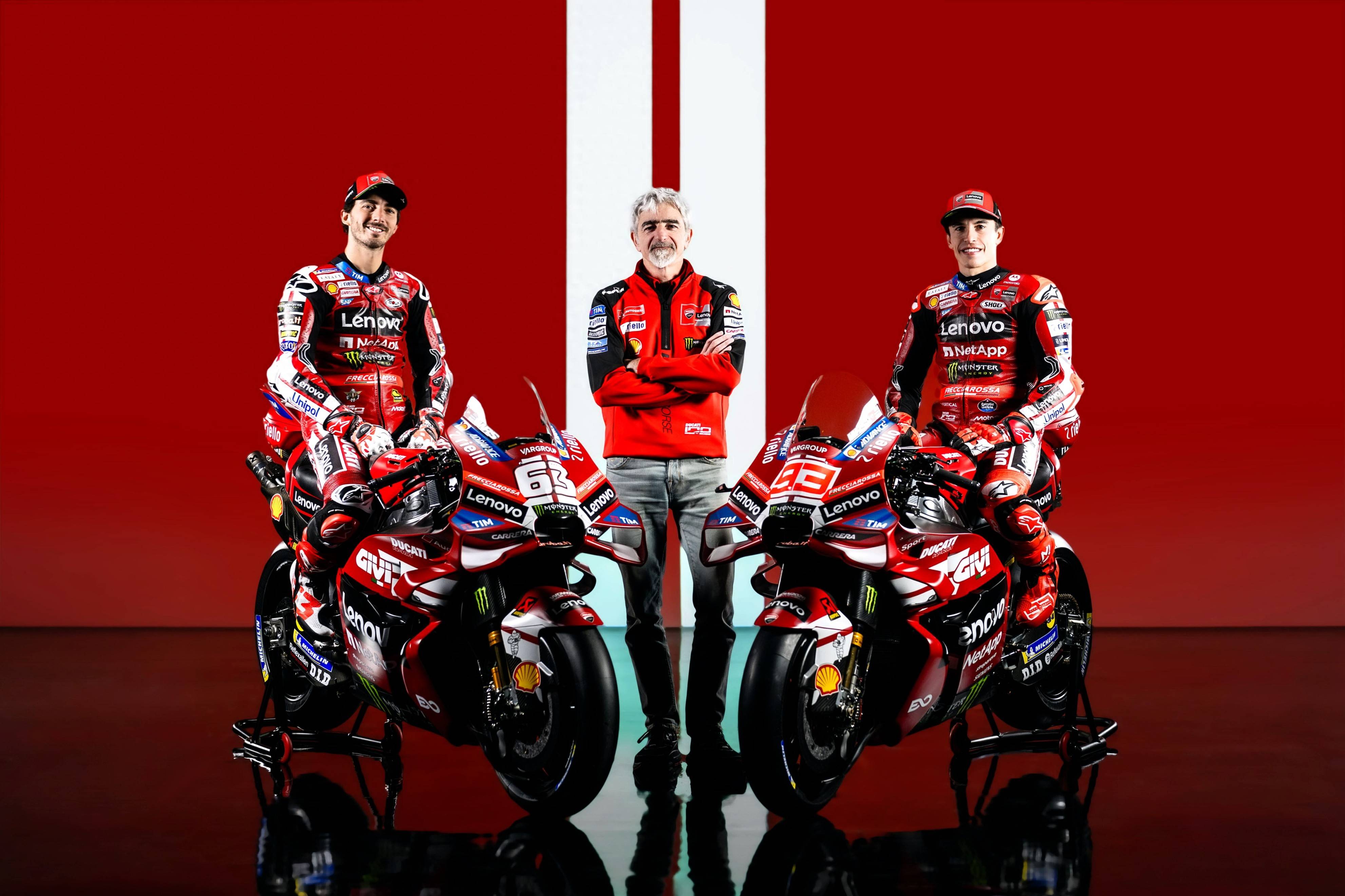 杜卡迪 MotoGP 工厂车队在新赛季沿用了去年的车手组合:驾驶 63 号车的意大利车手巴纳亚(Francesco Bagnaia),以及驾驶 93 号车的西班牙车手马昆斯(Marc Marquez)。2026 年是杜卡迪创立一百周年(1926 - 2026),车队在新赛季换上了一个哑光百年红(matt Rosso Centenario)为主色调、辅以白色线条的图案。