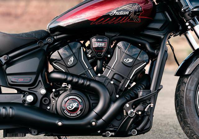 侦察兵 Bobber 一百二十五周年纪念版限量生产 450 辆,该车搭载一副水冷四冲程 V 型 60 度两气缸的 SpeedPlus 发动机,缸径、行程为 104 mm x 73.6 mm,排气量 1250 cc,最大马力输出 111 匹,峰值扭矩输出 108 N.m/6300 rpm。