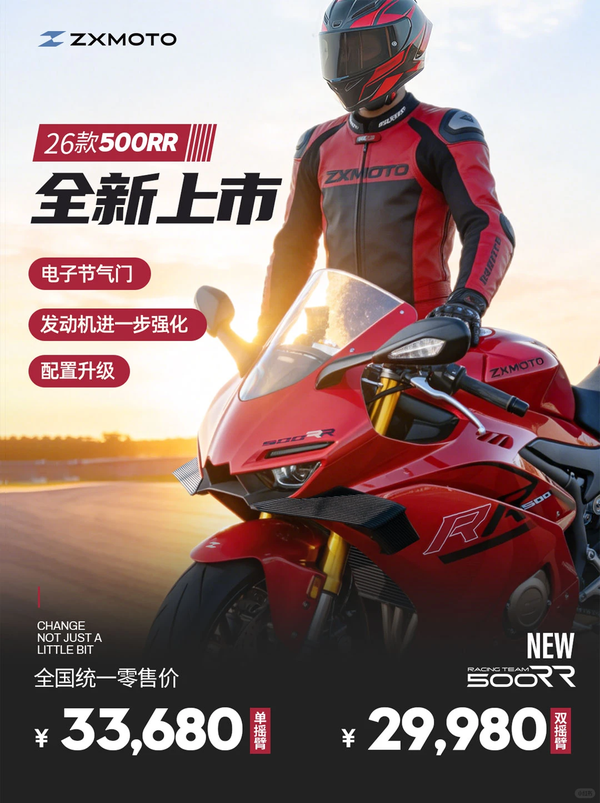 500RR走的是“入门四缸梦”路线,2026款双摇臂版售价29980元,最大马力84.3匹,新增电子节气门和双向快排,油耗降低6%。不到三万块就能玩四缸,还要啥自行车?