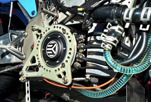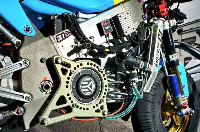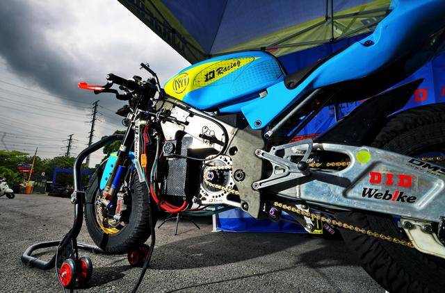 1、车体基于 1996 RS125 市售 GP125 赛车的车架/底盘打造,为对应国内电动车组别的赛事规则,原车架所采用的 17 英寸车轮、被修为改 12 英寸。从最初的设计、特制组件的开发、CNC 加工到最后装配、测试等,均由李俊自己操刀,这车称得上是他的 “ 半个孩子 ”;