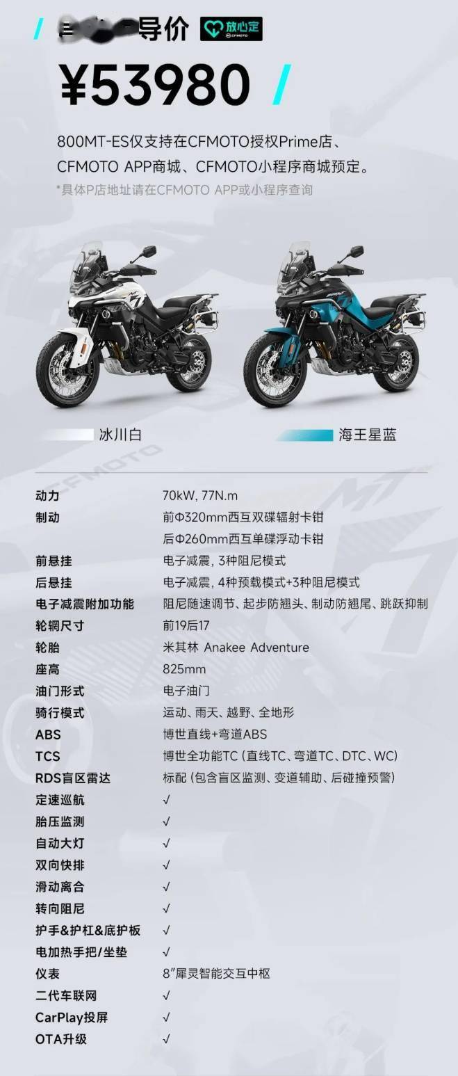 其他配置方面,该摩托车提供 70kW、77N.m动力,配备博世直线 + 弯道 ABS、博世全功能 TC (直线 TC、弯道 TC、DTC、WC),标配盲区监测、变道辅助、后碰撞预警等功能,支持 CarPlay 投屏。